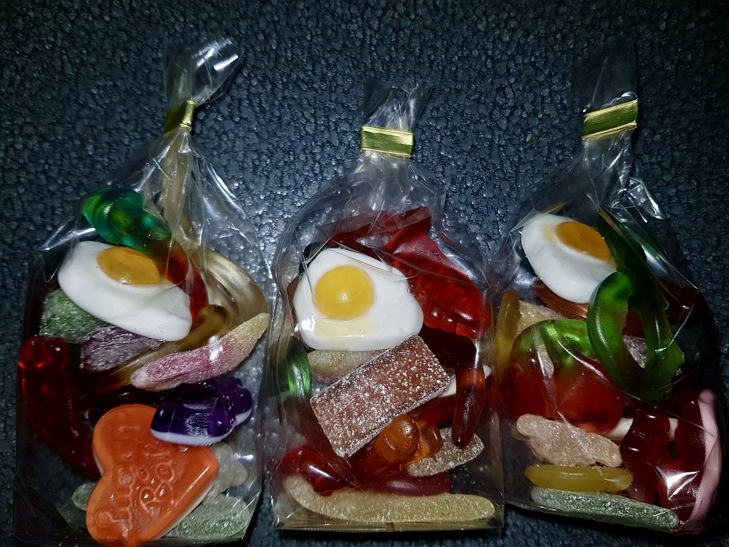eine Reihe von Ölbildern, die kleine gemischte Tütchen mit Süßigkeiten zeigen